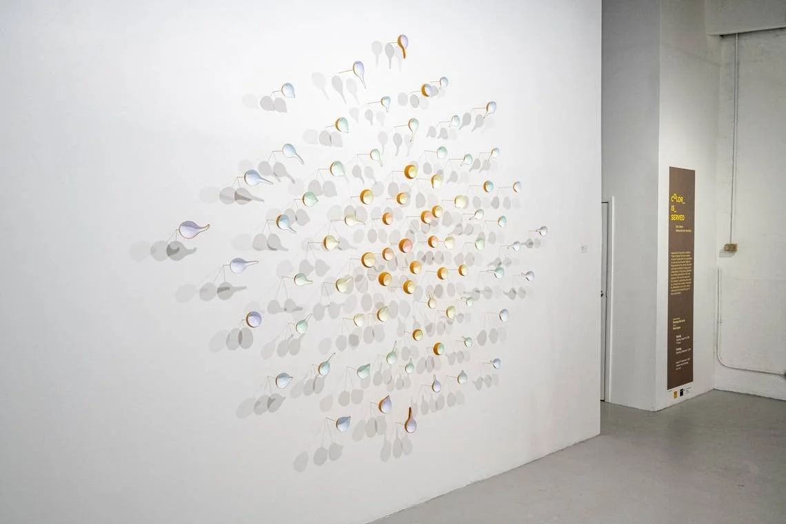 “COLOR_IS_SERVED” es ante todo una ofrenda a la naturaleza donde el arte funciona como religare. Alexandra basa cada una de sus instalaciones en un elemento natural específico (color del mar, taparas, mini-calabazas, espatas de palma). A partir de este elemento, la artista estructura y reconfigura el espacio a través de la serialidad que en perfecto acoplamiento con lo natural y el exquisito uso del color, engendra constelaciones expansivas donde la progresión geométrica genera un vibrato que se expande más allá de las dimensiones específicas de la obra para reconectar con el espectador.